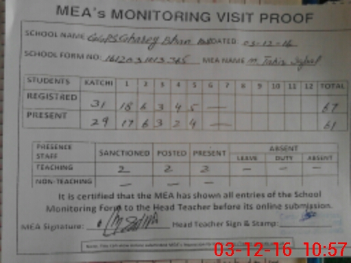 | Attendance Register | Head Teacher | MEA with School | Visit Proof |