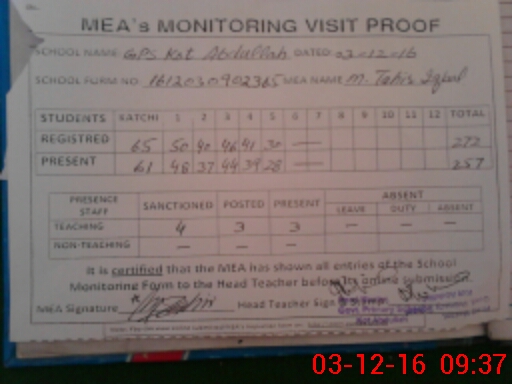 | Attendance Register | Head Teacher | MEA with School | Visit Proof |