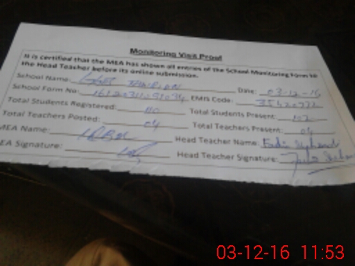 | Attendance Register | Head Teacher | MEA with School | Visit Proof |
