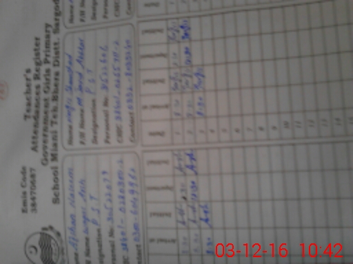 | District: SARGODHA | Tehsil: BHERA | Markaz: MIANI - FEMALE | Level: Primary | |