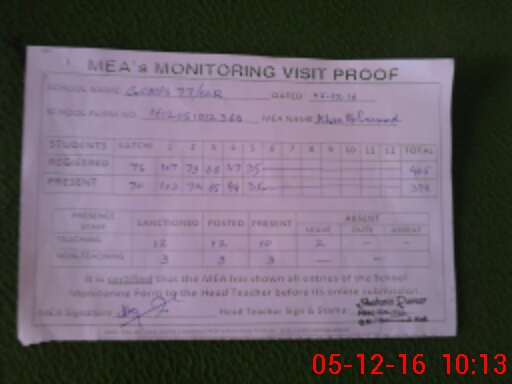 | Attendance Register | Head Teacher | MEA with School | Visit Proof |