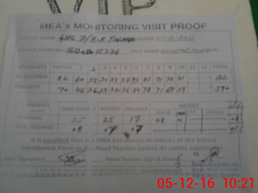 | Attendance Register | Head Teacher | MEA with School | Visit Proof |