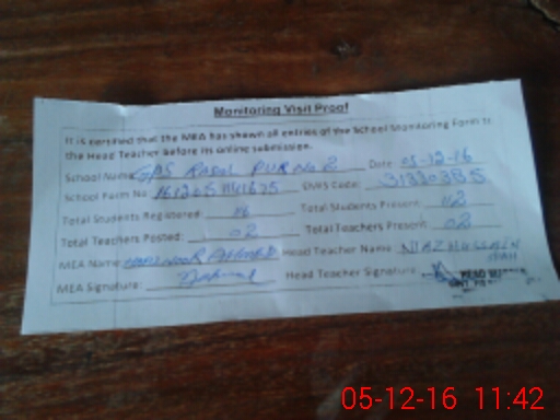 | Attendance Register | Head Teacher | MEA with School | Visit Proof |