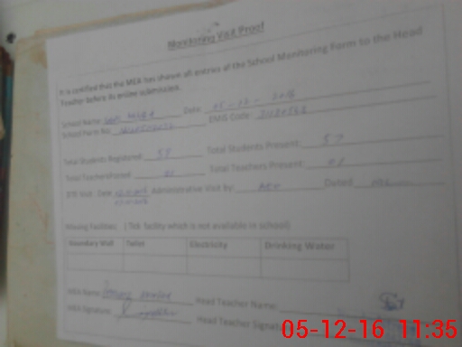 | Attendance Register | Head Teacher | MEA with School | Visit Proof |