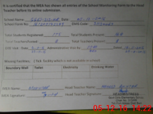 | Certified that this School was Inspected by the Undersigned MEA/DMO Today and the Information Stated Above is as Per Record. | |||||