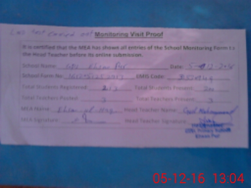 | Attendance Register | Head Teacher | MEA with School | Visit Proof |