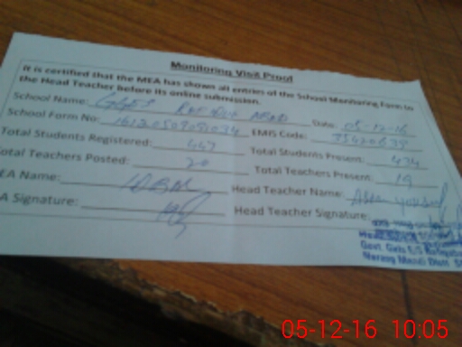 | Attendance Register | Head Teacher | MEA with School | Visit Proof |