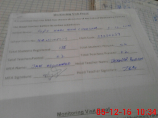 | School Visited by School Health & Nutrition Supervisor (No. of Visits) | 1 | Name1: | M Nawaz | Name2: | |