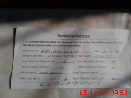 | Attendance Register | Head Teacher | MEA with School | Visit Proof |