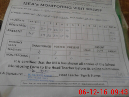 | Attendance Register | Head Teacher | MEA with School | Visit Proof |
