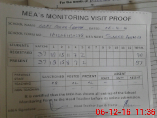 | Attendance Register | Head Teacher | MEA with School | Visit Proof |