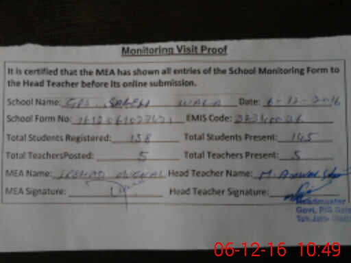 | EMIS Code: 32340036 | Name of School: GPS SALEH WALA | |||