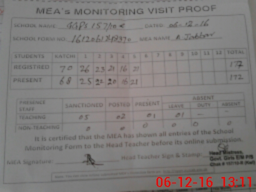 | Attendance Register | Head Teacher | MEA with School | Visit Proof |
