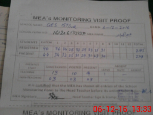 | Attendance Register | Head Teacher | MEA with School | Visit Proof |