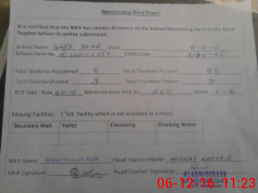 | Attendance Register | Head Teacher | MEA with School | Visit Proof |