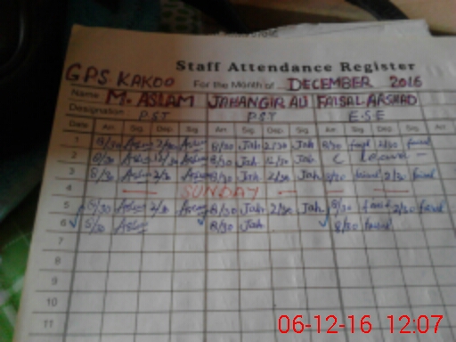 | School Visited by School Health & Nutrition Supervisor (No. of Visits) | 1 | Name1: | Tauqeer Khan | Name2: | |