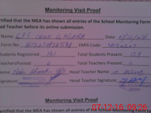 | Attendance Register | Head Teacher | MEA with School | Visit Proof |