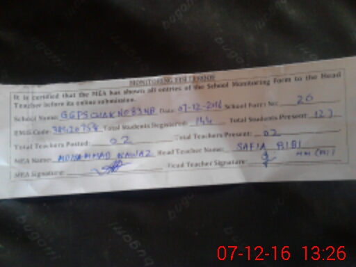 | School Visited by School Health & Nutrition Supervisor (No. of Visits) | 1 | Name1: | Peer Ahmad Ghous | Name2: | |