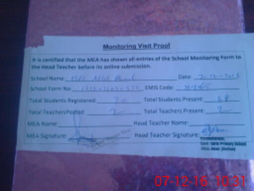 | Attendance Register | Head Teacher | MEA with School | Visit Proof |