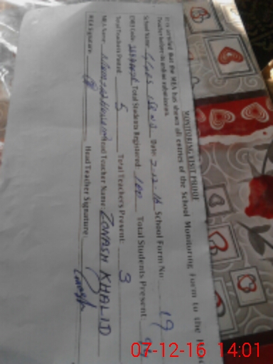| School Visited by School Health & Nutrition Supervisor (No. of Visits) | 1 | Name1: | Zill Hasnain | Name2: | |
