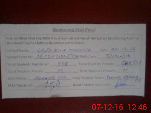 | Attendance Register | Head Teacher | MEA with School | Visit Proof |