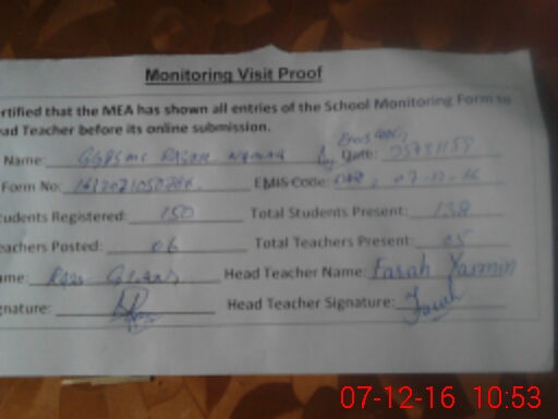 | Attendance Register | Head Teacher | MEA with School | Visit Proof |