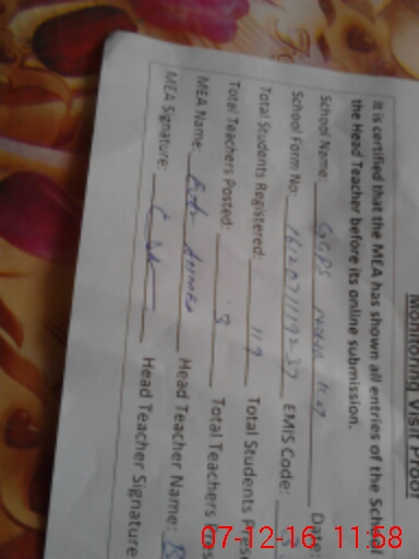 | Attendance Register | Head Teacher | MEA with School | Visit Proof |