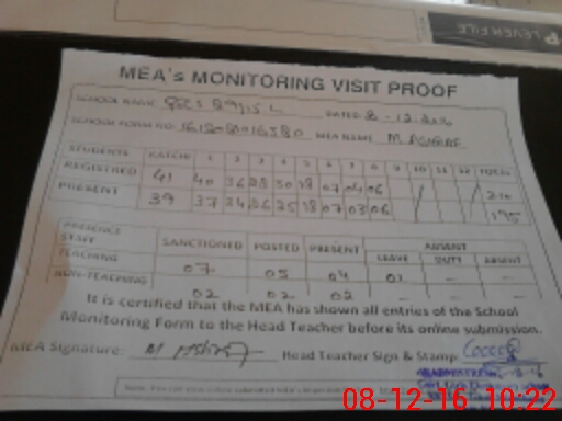 | Attendance Register | Head Teacher | MEA with School | Visit Proof |