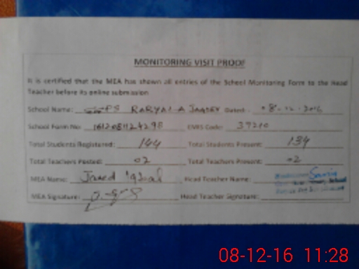 | Attendance Register | Head Teacher | MEA with School | Visit Proof |