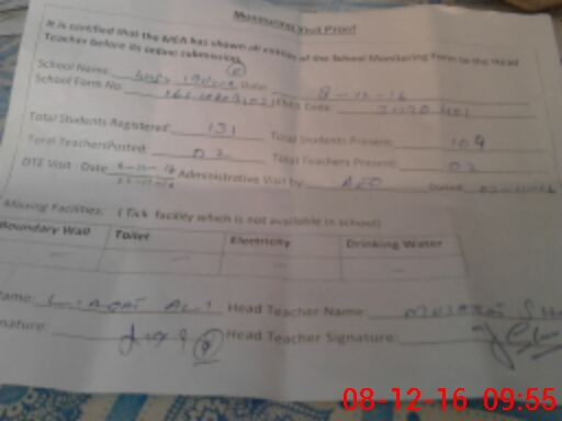 | Attendance Register | Head Teacher | MEA with School | Visit Proof |