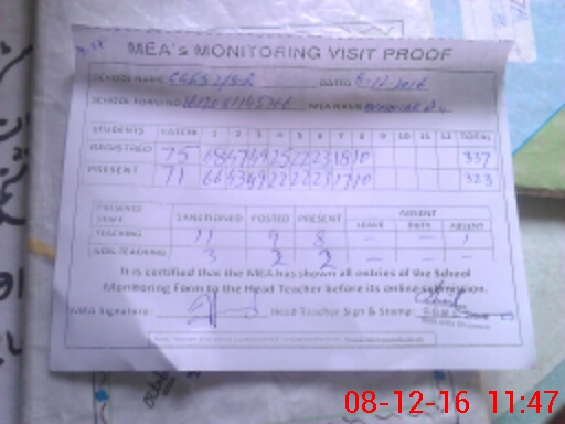| Attendance Register | Head Teacher | MEA with School | Visit Proof |