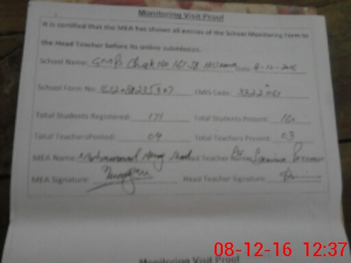 | EMIS Code: 33221167 | Name of School: GMPS CHAK NO 161 JB HUSSUANA | |||