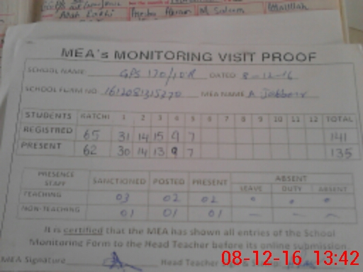 | Attendance Register | Head Teacher | MEA with School | Visit Proof |