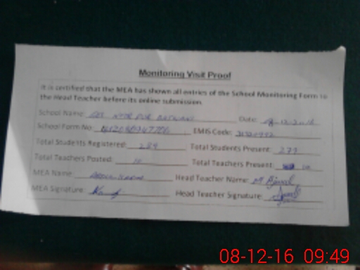 | Attendance Register | Head Teacher | MEA with School | Visit Proof |