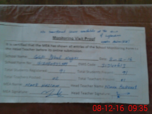 | Attendance Register | Head Teacher | MEA with School | Visit Proof |