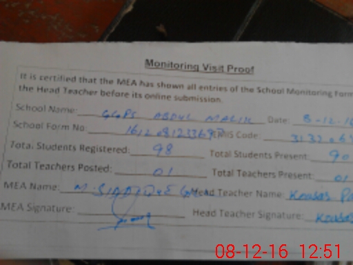 | Attendance Register | Head Teacher | MEA with School | Visit Proof |