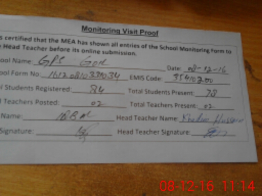| Attendance Register | Head Teacher | MEA with School | Visit Proof |