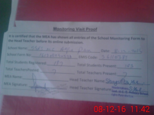 | Attendance Register | Head Teacher | MEA with School | Visit Proof |