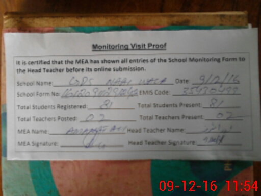 | Attendance Register | Head Teacher | MEA with School | Visit Proof |