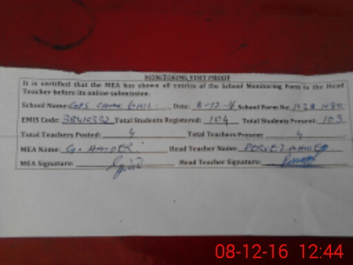 | Attendance Register | Head Teacher | MEA with School | Visit Proof |