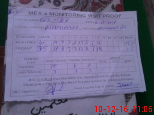 | Attendance Register | Head Teacher | MEA with School | Visit Proof |