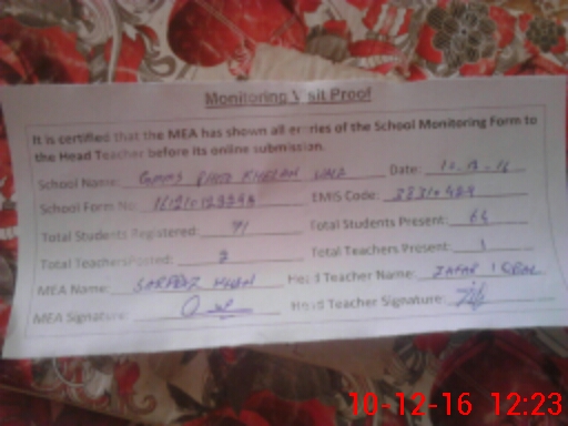 | Attendance Register | Head Teacher | MEA with School | Visit Proof |