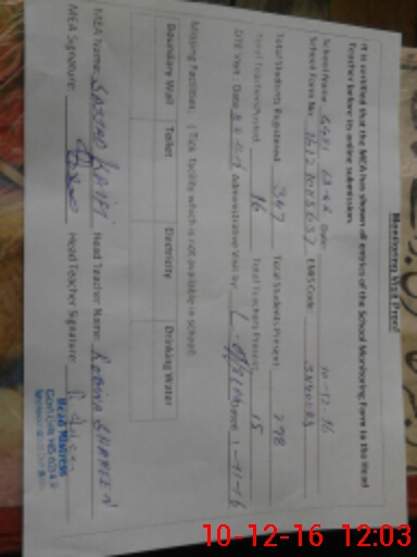 | Monitoring Date: 10-12-2016 | Start Time: 10-12-2016 11:41 AM | End Time: 10-12-2016 12:17 PM | Name of MEA: Sa**** Hu**** Ka**** BN**** 17 | |
