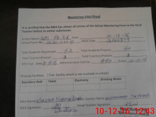 | Attendance Register | Head Teacher | MEA with School | Visit Proof |