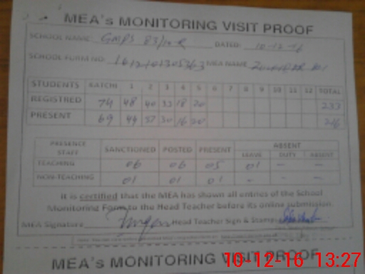 | Attendance Register | Head Teacher | MEA with School | Visit Proof |