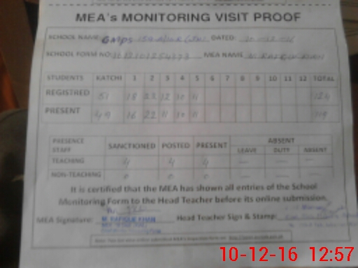 | Attendance Register | Head Teacher | MEA with School | Visit Proof |