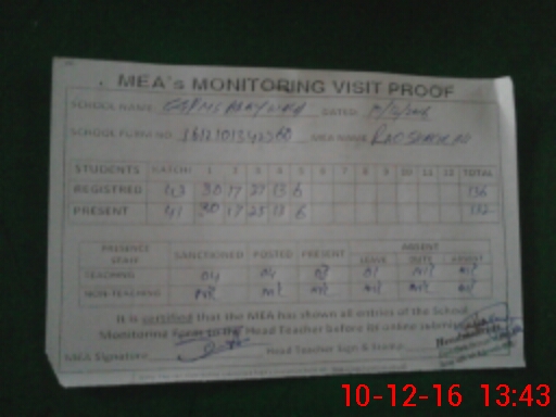 | Attendance Register | Head Teacher | MEA with School | Visit Proof |
