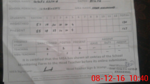 | Attendance Register | Head Teacher | MEA with School | Visit Proof |