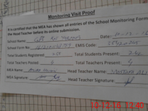 | Attendance Register | Head Teacher | MEA with School | Visit Proof |