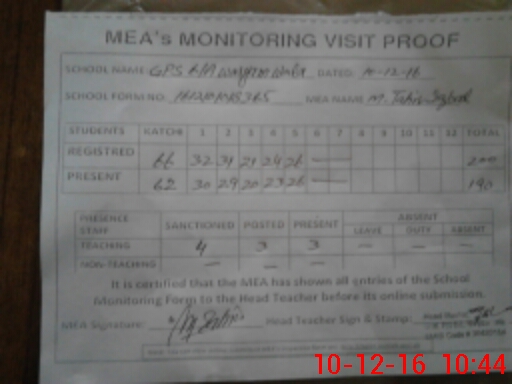 | Attendance Register | Head Teacher | MEA with School | Visit Proof |